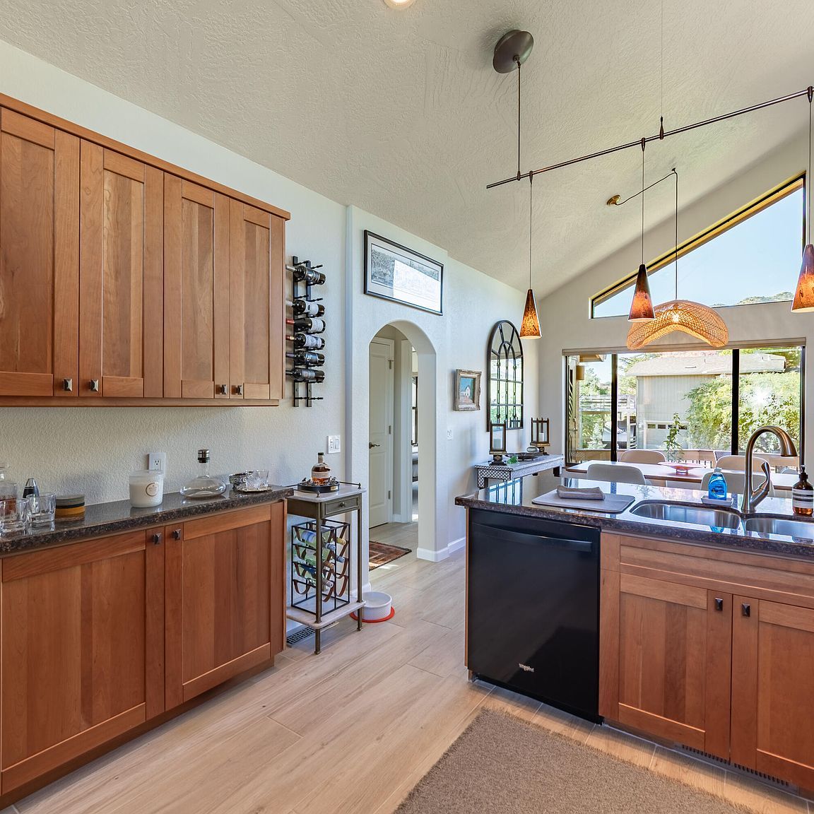 Every meal becomes special in this bright dining area, where a large picture window showcases Sedona's iconic landscape. High ceilings and thoughtful design create the perfect setting for both intimate dinners and memorable gatherings with family and friends.